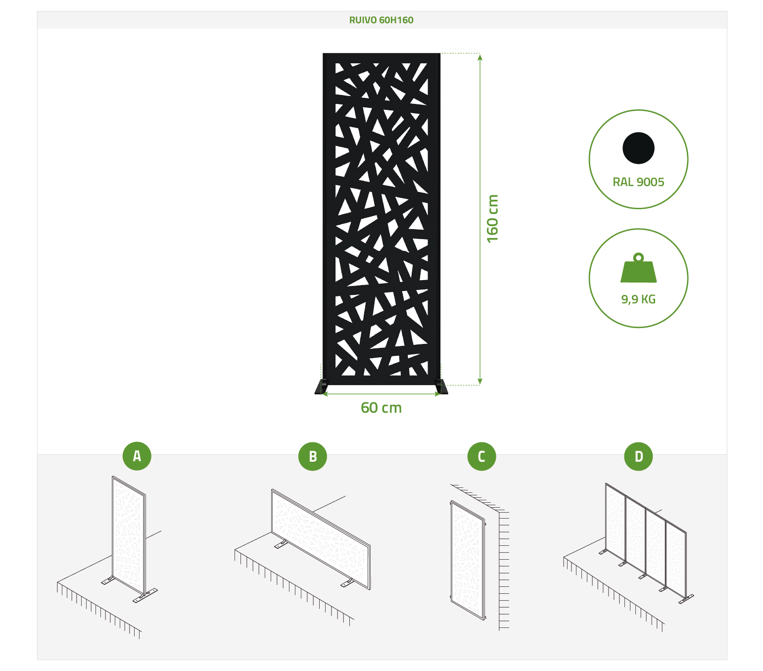 Die dekorativen Gartenpaneele von RUIVO bestechen durch ihre einzigartigen geometrischen Muster. Diese modernen Formen verleihen Ihren Außenbereichen eine grafische und zeitgemäße Note. Die robusten Stahlpaneele sind einfach zu montieren und verwandeln Ihren Garten oder Ihre Terrasse im Handumdrehen in einen ästhetisch ansprechenden und strukturierten Raum. Gleichzeitig setzen sie bei Zäunen oder Trennwänden dekorative Akzente.