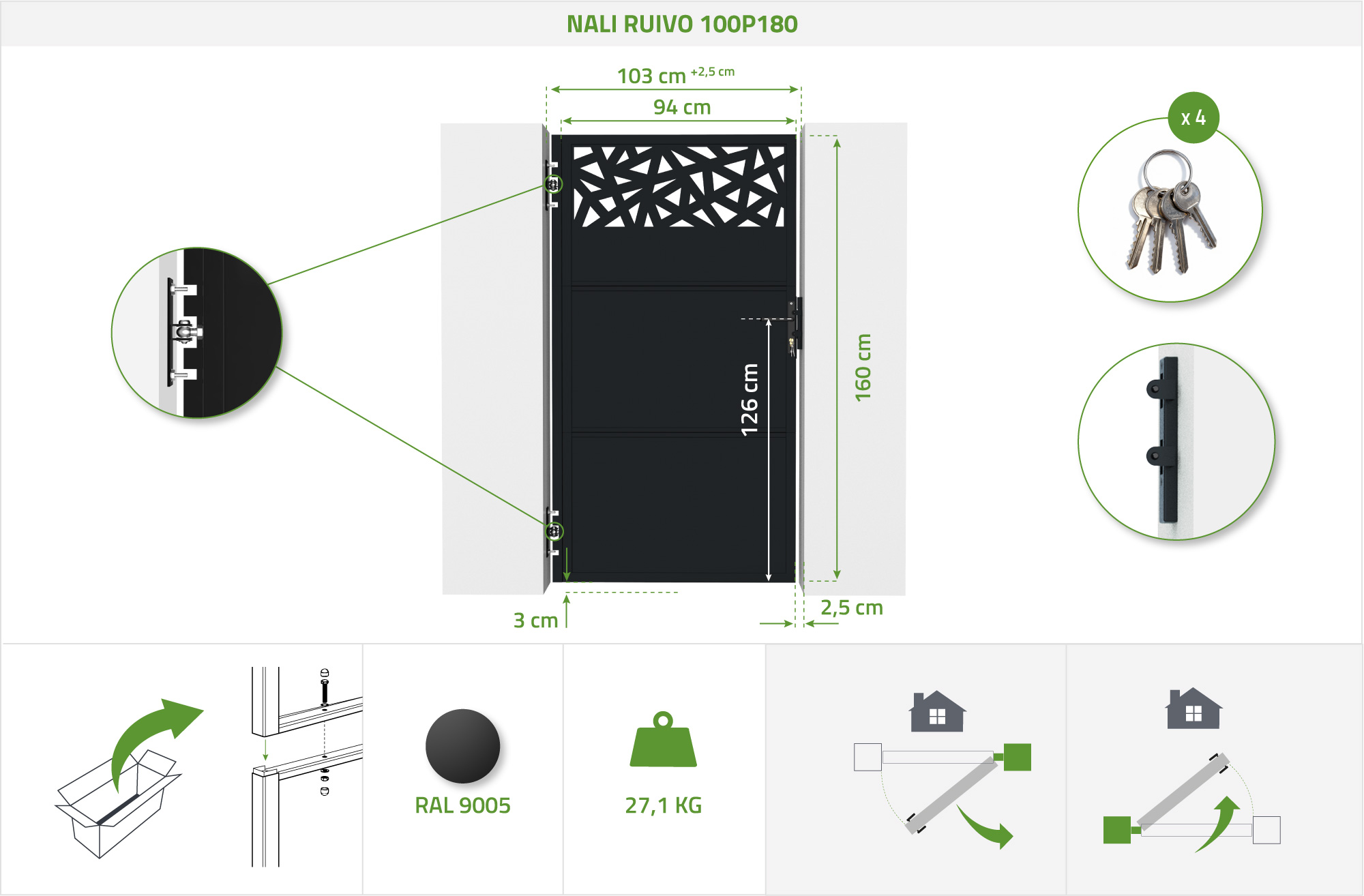 Sämtliches für die Installation Ihres Portals erforderliche Zubehör wird Ihnen zur Verfügung gestellt, und alles, was in unseren Portalen enthalten ist, ist in den technischen Eigenschaften des Produkts sowie in der Beschreibung angegeben.