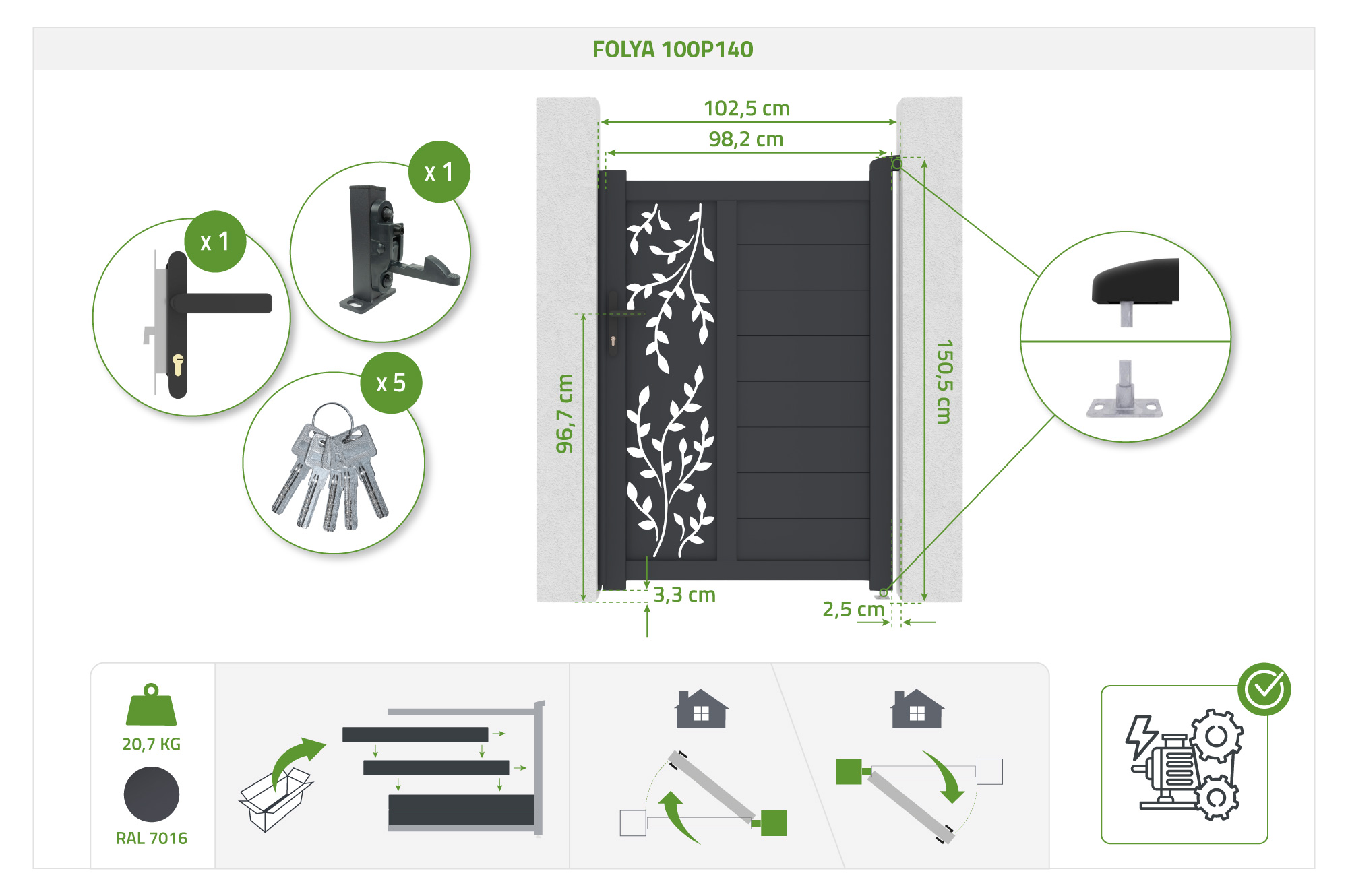 Sämtliches für die Installation Ihres Portals erforderliche Zubehör wird Ihnen zur Verfügung gestellt, und alles, was in unseren Portalen enthalten ist, ist in den technischen Eigenschaften des Produkts sowie in der Beschreibung angegeben.