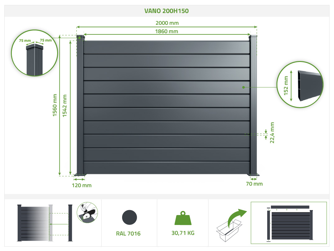 Zaunelement 2m VANO H.150cm graues Aluminium
